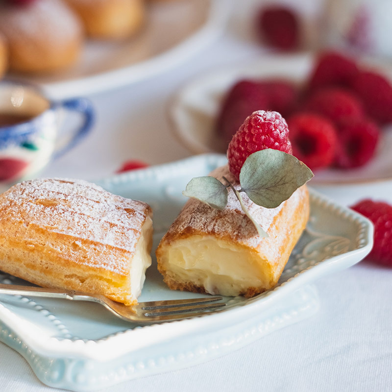· 50 g masła. · 2 gramy cukru pudrowego. · 1 g soli. · 100 gramów wody. · Niska mąka glutenowa 63 gramów. · 3 jaja (około 50 g każdy). · Materiał wypełniający krem. · 250 gramów lekkiego kremu. · 15 gramów sproszkowanej suga. | Krok 1: Wlej 100 g wody i 50 g masła do głębokiej patelni, dodaj 2 g cukru i 1 g soli. Krok 2: Po gotowaniu przez 30 sekund, zmniejsz ciepło i wlej 63 g wstępnie uszkodzonej mąki o niskiej wytrzymałości jednocześnie. Natychmiast po wyleaniu użyj ręcznego biorka na jajka, aby szybko wymieszać do gorącego ciasta, aż na ścianie garnka pojawi się krzepko. Wyłącz ciepło i przestań mieszać. Krok 3: Gdy ciasto jest ciepłe, dodaj trzy jajka w trzech oddzielnych partiach, za każdym razem mieszając. Krok 4: Umieść ciasto w torbie dekoracyjnej i wciśnij je w tacę do pieczenia z wyłożoną smarą. Krok 5: Rozgrzej piekarnik i umieść patelnię w środkowej lub górnej średniej piekarnika w 190-200 ℃ przez 20-25 minut. Krok 6: Natychmiast zdejmij prażone zaciągnięcia, pozwól ostygnąć i ścisnąć w napełnieniu kremowym, a my czekamy na ochłodzenie Eclairs Aby ubić śmietanę, musisz dodać 15 g cukru pudru do 250 g lekkiej śmietany. Krok 7: Włóż bitą śmietanę do torby dekoracyjnej. Końcówka dekoracyjna robi małą otwór na dnie zaciągnięć, aby wcisnąć bitą śmietanę. |